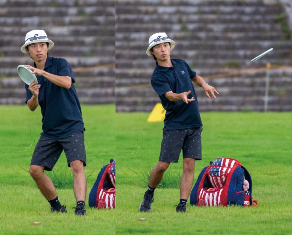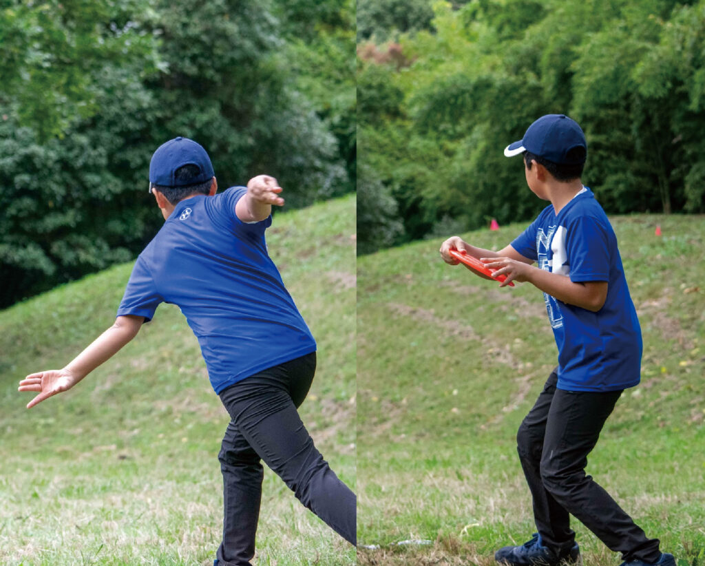 テニスのフォアハンドや、野球のサイドスローに近いイメージの投げ方で、ディスクを持つ手を体の横から腕を振り出すようにして投げます。手首のスナップを使ってディスクを前方へ送り出すのが特徴で、障害物を避けたい場面や、曲げてラインを作りたい場面でも有効です。
