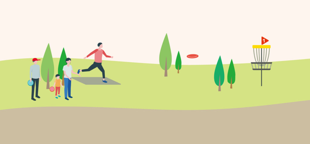 - ディスクゴルフコースには、風や木々、川、山や谷などのアップダウンといった、さまざまな自然の要素があります。そうした自然の障害物もコースの魅力のひとつです。まっすぐ投げるだけでなく、地形や風を読みながら、自分なりのルートでゴールを目指しましょう。