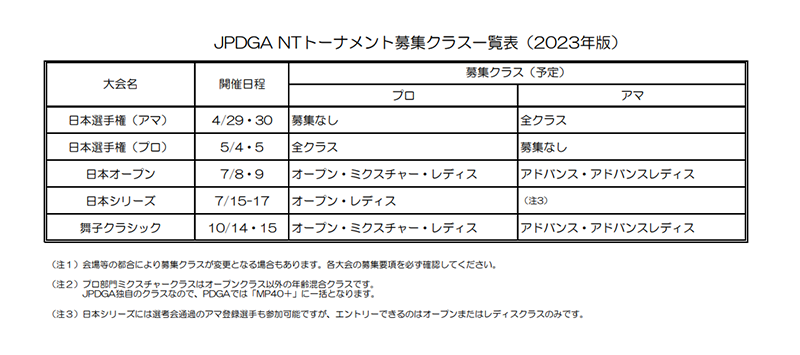 2023年シーズンより各部門の登録クラスは年齢により自動的に振り分けられ、年間ランキングを決めるポイントが参加したクラス毎に集計されるよう変更となります。しかしながら、募集クラスが最上位クラスに限られる大会もあるため、下位クラスの選手が不利にならないよう、NTに関してはプロ部門・アマチュア部門共に登録クラスもしくは参加クラスのどちらかでのポイント付与を選択できるものとします。