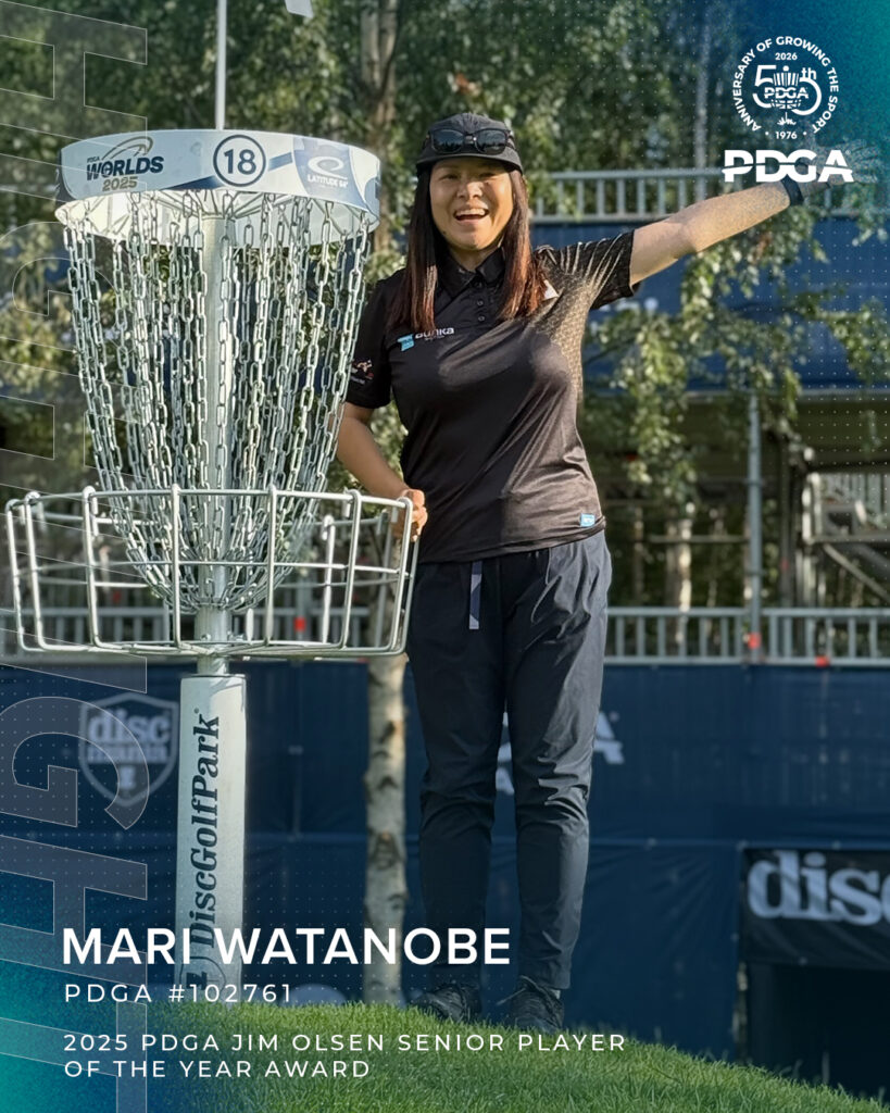 渡部麻里選手(JPDGA#2599 / PDGA#102761)が、PDGA(Professional Disc Golf Association)2025年「年間最優秀シニア選手賞 – ジム・オルセン・シニア賞(Senior Player of the Year – Jim Olsen Sr. Award)」を受賞されました。