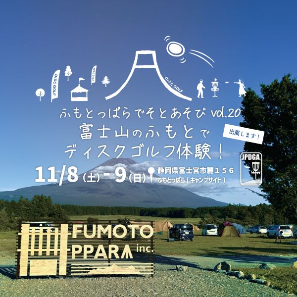 日本ディスクゴルフ協会では、静岡県富士宮市で開催されるアウトドアイベント「ふもとっぱらでそとあそびvol.20 」にて、ディスクゴルフの体験イベントを実施します!